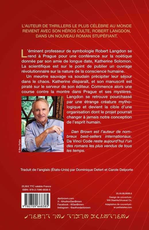 Un meurtre sauvage va soudain précipiter leur séjour dans le chaos. Katherine disparaît, et son manuscrit est piraté sur le serveur de son éditeur. Commence alors une course contre la montre dans Prague et ses mystères. Langdon se retrouve pourchassé par une étrange créature mythologique et devient la cible d’une organisation dont le projet pourrait changer à jamais notre conception de l’esprit humain.