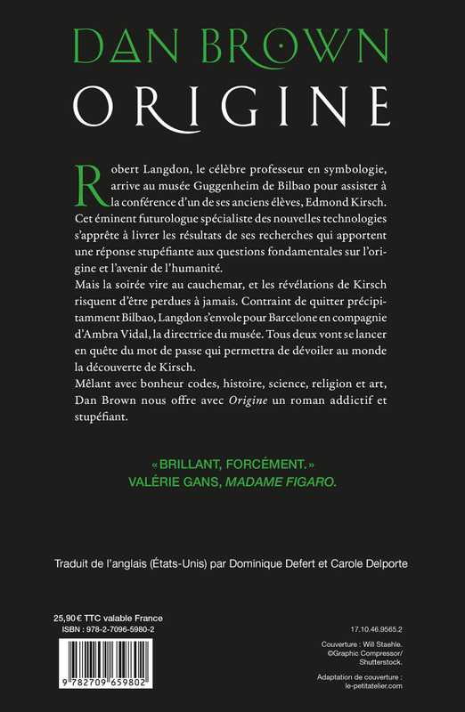 Mêlant avec bonheur codes, histoire, science, religion et art, Dan Brown nous offre avec Origine son roman le plus ambitieux et le plus étonnant.